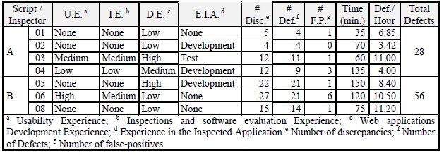 Although the fact that one of the goals of this study was to evaluate the proposed APIU assistant tool, it was possible to verify the number of defects found by the inspectors using the WDP-RT technique. Among the inspectors, three of them had developed similar applications; however, they had never participated in the development of the inspected application. Furthermore, only one had previous knowledge about usability inspection. Table 4 presents the individual results of the inspection.