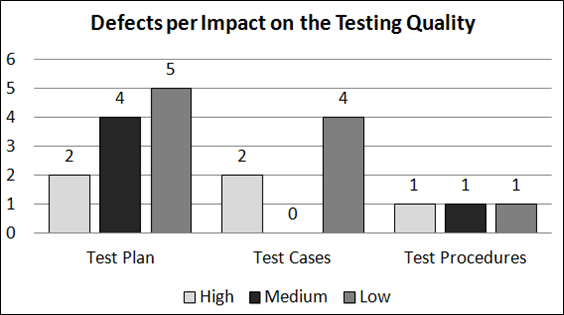 The 27 reported defects were analyzed by the researchers and the artifacts’ author, who would be the professional responsible for the tests’ execution in this project. Removing duplicated defects 20 new defects were identified (Test Plan: 11 defects; Test Cases: 6 defects; Test Procedures: 3 defects). The author classified them according to their impact to the quality of testing activity in three possible levels (Figure 5):
