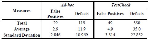Then a second experimental study was conducted with the objective of evaluating the modifications made in TestCheck and their impact on the rate of false positives encountered. The aim of the technique continued to be providing a higher rate of defect detection when compared to an Ad-hoc technique. The data obtained points to a positive result, with the rate of false positives per inspector having gone down from 12.5 to 4.9 when compared to the results obtained in the first study.