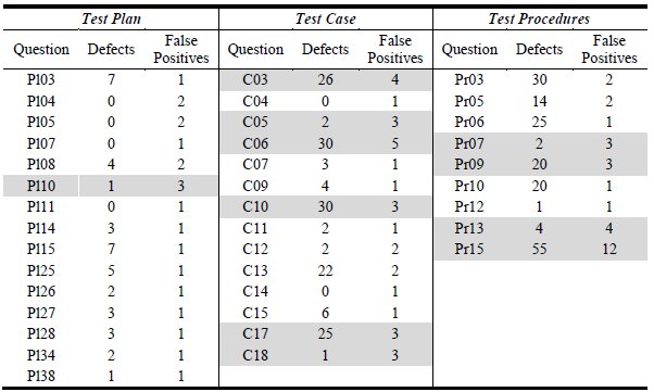 Table 8: Defects and false positives per TestCheck question (version 1.0)