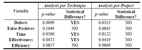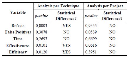Analyzing the software project, no statistical difference was found for any of the variables, suggesting the technique would be the factor that influences the results.
