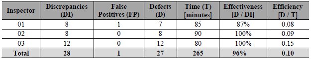 In order to assess the feasibility of the proposed inspection technique, we analyzed the variables: defects detected, occurrence of false positives, and the time each inspector needed for the inspection, as shown in Table 5. Two other variables were also analyzed, derived from the data obtained from the simple variables cited. They are: