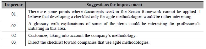 The improvement suggested by inspectors 01 and 03 refers to the creation of checklists directed toward companies that use agile methodologies. However, in this study we aimed to develop an approach that could be applied in different contexts, independently of the development methodology employed by an organization. That way, the TestCheck approach would be adaptable, bearing in mind that there is a wide range of items on the checklists, which allows firms to choose the items that fit the context of their company.