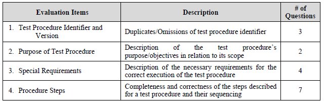 The checklist for inspecting the specification of test procedures evaluates 4 items (listed below), detailed in 16 questions, as shown in Table 3.