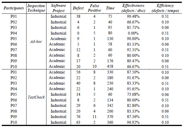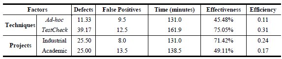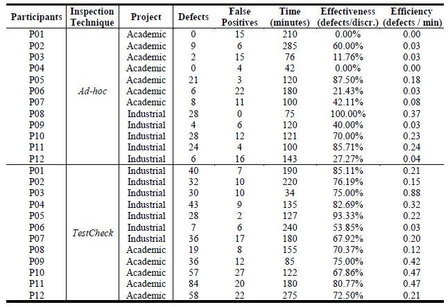 In regard to the variables’ effectiveness and efficiency, the TestCheck technique obtained positive results for both when compared to the Ad-hoc technique. The average in relation to effectiveness was 75% for TestCheck, against 45% for the Ad-hoc technique. The average regarding efficiency was 0.31 defects/minute for TestCheck, against 0.11 defects/minute for the Ad-hoc technique. Analyzing the results of the two variables per software project, we can see that the average of one project is disproportional to the other in regard to the variable effectiveness (71% x 49%), but fairly similar for the variable efficiency (0.24 x 0.17 defects/minute).