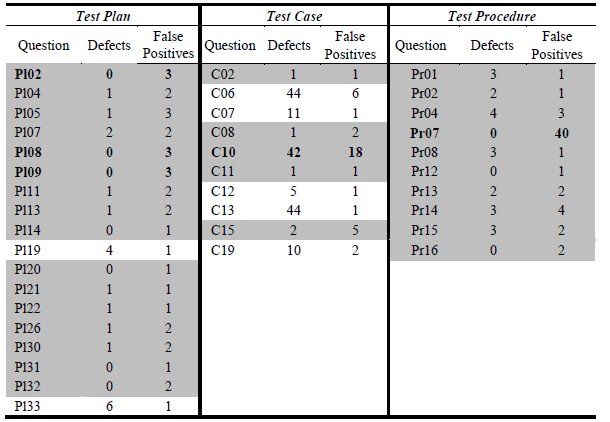 A total of 31 questions (out of the 75 questions that constituted the 3 checklists in version 1.0) were selected as candidates for evolution. They were revised and rewritten (not necessarily all of them) to create a new version of TestCheck. Some questions required more attention, as is the case with questions Pl02, Pl08 and Pl09 of the test plan, C10 in the test case, and Pr07 in the test procedure (all boldfaced in Table 8), which had a high rate of false positives. Several factors may have had an influence on this result, one of them being the question’s wording, which could have led inspectors to different interpretations.
