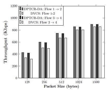 as shown in Figure 4. Again, the DPTCR-DA is compared against DVCS as both RI-DMAC and DVCS have similar characteristics when deafness does not occur. The simulation results for this scenario are displayed in Figures 6, 7, 8. These figures show the DPTCR-DA and DVCS comparison in terms of throughput, jitter and end-to-end delay, respectively. In all addressed cases, DPTCR-DA was able to attain a superior performance than DVCS. Indeed, when using DPTCR-DA, it was able to provide throughput improvement up to