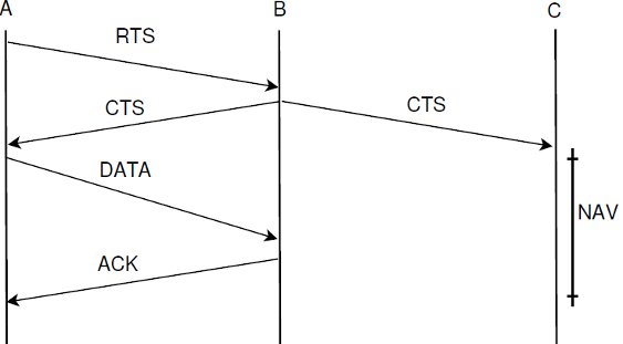 The IEEE 802.11 allows a host to verify the status of medium in two different ways: physical or virtual carrier-sense. When the channel state is sensed busy by either mechanism, the channel is considered busy and, otherwise, idle. Physical carrier sensing is a costly operation in terms of power consumption [ 23]. Also, physical carrier sensing may not provide information regarding the amount of time an ongoing communication will last. As explained above, the RTS/CTS have information about the duration time of the communication. Thus, a neighboring node overhearing an RTS/CTS frame sets the channel as busy for the duration contained in the control frames, as node C does in Figure 1. This feature is implemented via the Network Allocation Vector (NAV). The NAV has a counter that represents the remaining time of the current communication. When the NAV is not set, the physical carrier sense is then used to ensure that the channel is idle.