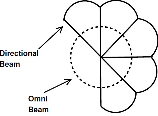 Owing to its beamforming capability of concentrating energy towards a given sector, a directional antenna presents several advantages over omnidirectional counterparts, particularly in terms of spatial reuse [ 5] [ 6] [ 9]. This feature minimizes interferences and allows for increasing transmission range. In this work, it is considered the use of switched beam antenna (Figure 2) with characteristics similar to those described in [ 21]. A switched beam antenna consists of dividing the antenna in