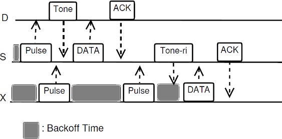 Channel reservation using pulse/tone signals is similar to the IEEE 802.11 standard coupled with DVCS [ 19]. Therefore, channel reservation using pulse/tone signals also uses a 4-way handshake as the example illustrated in Figure 3. In this example, it is assumed that node