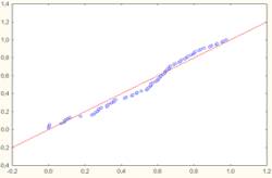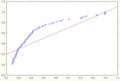 The diagram of data scattering is clearly not linear. Thereby, it is reasonable to assume that the data do not have a normal distribution. To enhance the normality it was applied a normal transformation, in other words, log in the e basis. The third figure shows the diagram of normal probability after the application of a logarithm transformation over the effort values of the second training group.