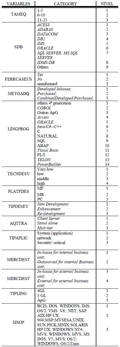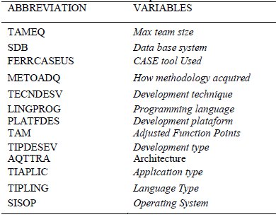 The initial process of variables selection it is based on literature studies about variables that influence the effort (5). It was selected 14 independent variables (Table 1) and the dependent variable: (Summary Work Effort).
