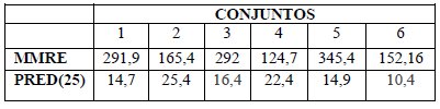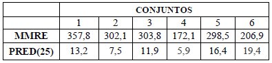 Based on the technique presented in the fourth section, there were built six groups of test and training. Thereby the test data group 1 was built removing the projects: 1, 7, 13, 19, 25, 31 (