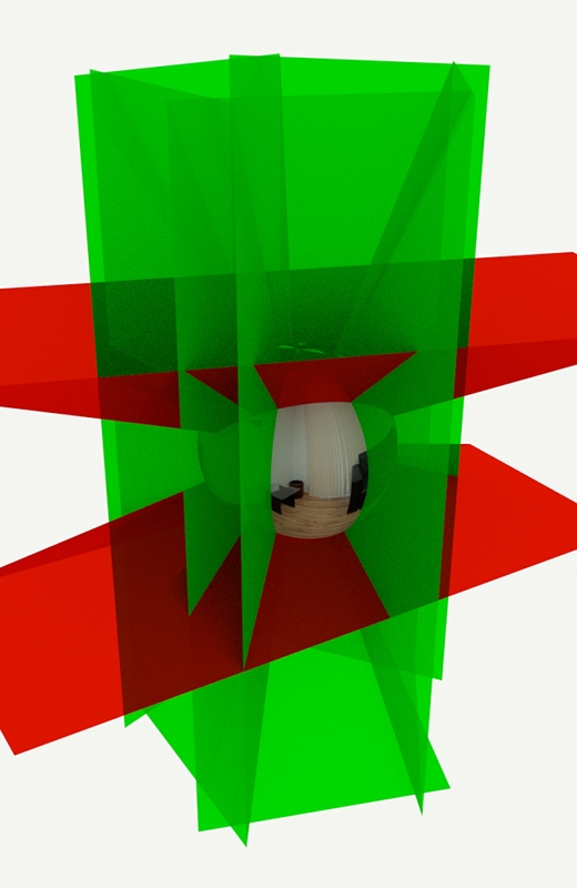 The level of detail of the environment reconstruction (see section 6) will depend on how you need the final render to be. For example, in a scene with no objects with glossy reflections, the environment mesh can be simplified to define only the main features that contribute with the lighting of the scene (e.g., windows and ceiling lamps) and a bounding box. Every ray starting at the light origin in world space must intersect with some primitive. Since our primary goal is to render a full panorama image, we need to make sure the light field has the depth of all the rays. Thus it is important to model the environment mesh around all the scene without leaving holes/gaps.