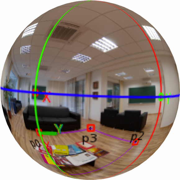 An equirectangular panorama is a discretization of a sphere in the planar space of the image. As such, there is an implicit but often misleading orientation of the representative space. The top and bottom part of the images represent the poles of the sphere. The discretized sphere, however is not necessarily aligned with the real world directions. In other words, the north pole of the sphere/image may not be pointing to the world’s zenith.