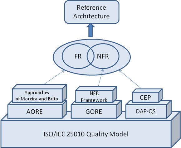 The architecture of a software system is defined in [7] as a set of components and connectors, with precise behavior. Documented architecture [8] [9] must meet both FR and NFR requirements of the system. Architecture design considers that every architectural decision (for example, add and/or remove components and/or connectors) is justified on the basis of having verified that the quality requirements are met. A Reference Architecture (RA) is a generic architecture from which all products (systems), family members of the domain, can be generated [10] from a reusable common core of assets. The term RA is widely used in the context of software product lines and we use this term because in our context, RA is derived from the domain knowledge, taking into account the basic functionality and overall NFR of the domain, for which RA is generally responsible for. Our proposition is based on establishing RA from DA process using one of the approaches of Goal-Oriented Requirements Engineering (GORE) [11]. The GORE approach involves the intentional point of view, that is to say, the interest of all participants or stakeholders of the software project to obtain, through a refinement step, the system’s requirements. A goal is the interest that the system, artifact, process or activity, must achieve [11]. This approach proposes a more natural language to analyze requirements, decomposing them into a logical structure expressing the whole system’s needs. Within the GORE context, the NFR framework [12] introduces the operationalization concept, which states the way to implement a NFR as an architectural component; in this context a NFR is called “softgoal” and it is in general a goal difficult to express and not directly perceived by the user [8]; a FR instead is called “hardgoal”. A graph structure, called Softgoals Interdependency Graph (SIG) is used to decompose and relate softgoals [12]. GORE proposes other approaches for requirements analysis, such as KAOS (Knowledge Acquisition in Automated Specification of Software) in [14] and the i* Framework in [15], however we will discuss here only the approaches that have been used in our research. We consider in this paper explicitly the NFR Framework of the GORE approach, as it is used by for analysis and design by Supakkul and Chung [16]. Aspect orientation is considered by the integration of crosscutting concerns to the use case model of Moreira, Brito and Araujo [17], following the approach called "early aspects" of the Aspect-Oriented Requirements Engineering (AORE) [18]; they state that crosscutting concerns, which are properties of interest that are used by or crosscut other properties, are taken into account at early stages of the software development process in order to avoid problems of entangled or scattered code later on. Losavio, Matteo and Pacilli [19] have recently incorporated this approach to the Chung Extended Process (CEP), also defined by Losavio, Matteo and Pacilli in [8]. Finally, standards for product quality specification are included into the Domain Analysis Process with Quality Standards (DAP-QS), with the proposal of Losavio, Matteo and Rahamut [20], where the ISO/IEC 25010 standard quality model is used to specify the domain QR.