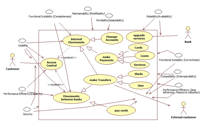 The RNF's security and usability are associated with the customer actor; the external customer actor is associated with security, efficiency (behavior in time), functional suitability (correctness), compatibility (interoperability) and the bank actor is associated with reliability