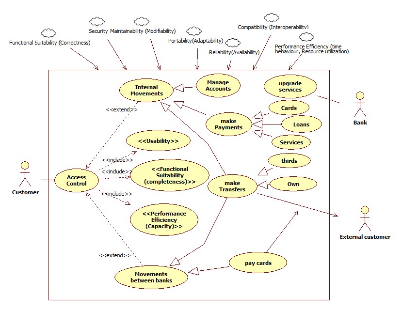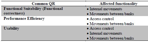 After determining the main functionalities of the domain, they are with quality characteristics that must be fulfilled for each one of them. The functionality "internal movements" are transactions involving both consultations and transfers and payments within the same organization, so that it requires security, efficiency, usability, reliability and functional suitability. In the case of "movements between banks" in addition to the above-mentioned quality characteristics, support is required for the interoperability of the systems involved. Finally the functionality of Access Control involves the QR of functional suitability, usability, security, and efficiency (see table 3).