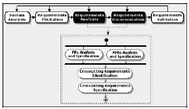 In the de Sousa methodology, Goal-Oriented Requirements founded on the Separation of Concerns, arises the (GREMSoC) methodology, which aims to produce improvements in requirements specifications, with focus on the separation of concerns. This methodology addresses the crosscutting requirements in the phases of Analysis and Documentation of Requirements Engineering, as shown in Fig. 16 [31]. The process is divided into four main activities: FR analysis and specification, NFR analysis and specification, crosscutting requirements identification and crosscutting requirements specification. For the second activity, they use an adaptation of the NFR Framework proposing the specification of the NFR in specific composition tables, indicating when the requirements are affected and when the crosscutting requirement can be activated by the operators "overlap" and "override", eliminating invasive or direct relationships of crosscutting requirements with the affected requirements.
