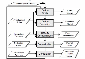 Navarro also integrates aspect and goal oriented approaches, with focus on a proper and organized document of system requirements, taking into consideration the ISO/IEC 9126-1 standard, which is the older version of ISO/IEC 25010, to specify NFR. The proposed methodology [32], called ATRIUM defines software architectures from requirements. It is oriented to the concurrent definition of requirements and architecture through five (5) general activities (see Fig. 17). The first activity of integration of FR and NFR is based on the NFR Framework and the KAOS technique [11][32], obtaining a goals model of the product, defined in [32] as the set of graphs that are interrelated to each other, which is obtained determining stakeholders needs in addition to the review of all existing documentation of the current system.