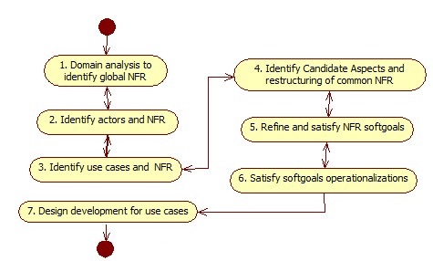 Restructuring common NFR: in this activity, NFR that can be candidate aspects are identified; they are represented in the use case diagram applying the generalization/specialization principles of UML and the propagation rules of Supakkul and Chung [16].