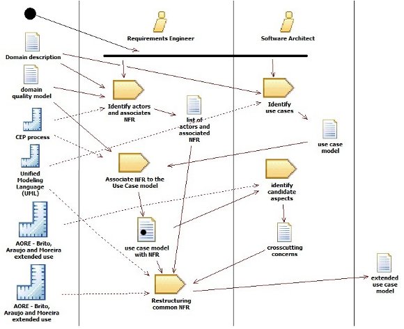 In the development of this discipline, the actors involved are software architects and requirements engineers. These actors take as input the artifacts "domain description", "quality model", “policies and guidelines” issued by the CEP process [19], Brito, Araujo and Moreira [17] for both the extended use case model and the composition tables are followed, generating the following intermediate artifacts: list of actors and associated NFR, use case model, use case model with NFR and crosscutting concerns; they contribute to construct the Extended use case model that includes domain global NFR and all the identified crosscutting concerns.
