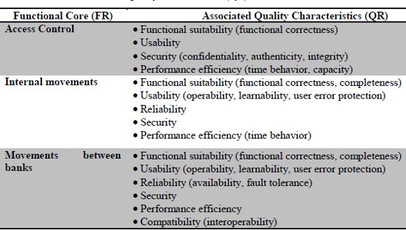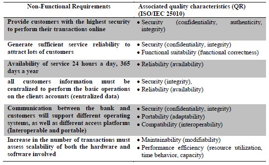 The non-functional core is the union of the quality characteristics determined in previous activities (constraints and business rules and quality of candidate architecture); table 6 them in details the online banking non-functional core.