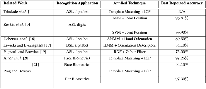 A more remarkable set of contributions from the ICP procedure may be borrowed from researches exploring biometrics. Amor et al. [20] built a classical probe-and-gallery model and successfully recognized face depth images from arbitrary points of view using the ICP shape matching. In [21], concerned with efficiency, the authors proposed a spatial voxel indexation model associated with a database repository. This association was then used to perform constant time computation of the closest points in an ICP iteration. Both works use only the common mean square distance error to identify shape congruences. Moreover, ICP studies on 3D shape biometrics often rely on body parts which are more statically fixed when compared to the high degree of freedom (DOF) context of hand gestures, so it is simpler to achieve higher accuracy (Table 1).