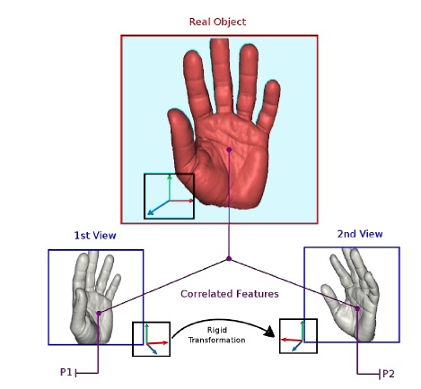Iterative Closest Point (ICP) [10] is the dominant fine registration algorithm in the literature and it aims at the retrieval of an accurate solution to the Euclidean rigid motion between two 3D point surfaces. The rigid motion (transformation) is usually recovered by means of the scale, rotation and translation components that bring the two point sets to a same spatial orientation. This way, the ICP algorithm works by iteratively minimizing the cost function of the distances computed between selected corresponding points in the two surfaces (Figure 3). In turn, the cost function is usually associated with a mean square distance metric which it is mathematically stated to always converge to the nearest local minimum [10].