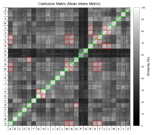 In the figure, The squared-marked clusters in the anti-diagonal represents the Mean Inliers metric values of the elements within the same class. Thus, these clusters have the brightest colors compared to others on their respective rows. On the other hand, the remaining sparse squared-marked clusters in the figure illustrate the most ambiguous correspondences values for incorrect matches. These clusters still have a bright color but but they have less intensity than those on the anti-diagonal. Table 3 shows the average similarity for these elements. With some small differences from the ambiguities suggested in [19], the most ambiguous sets in terms of Mean Inliers similarities are