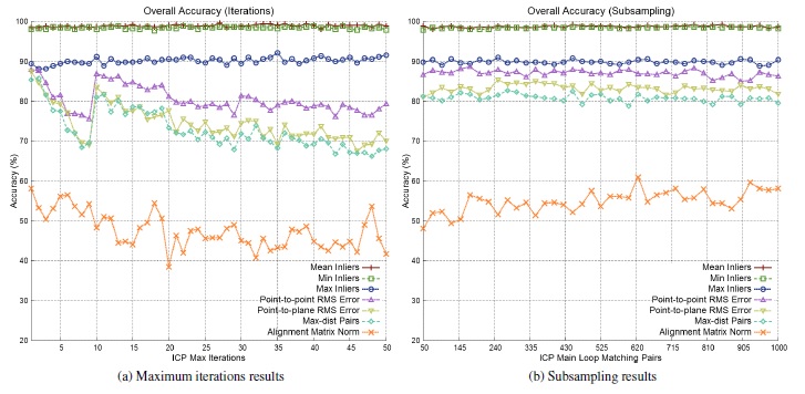 - Accuracy always achieves its best performance with the Mean Inliers metric, so it is the best choice for the ICP correspondence metric on the proposed methodology;
