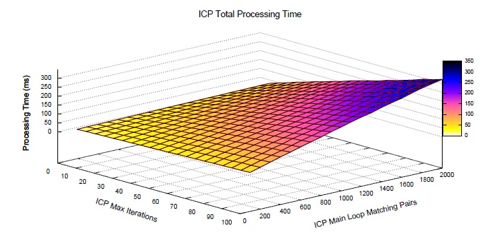 Through a dimensional point of view, the efficiency of the ICP procedure is dominated by the change of the iterative elements of its input parameters. This is justifiable since other ICP elements, like the proposed application of modifiers, are considered a natural extension of the processing, with their time complexities dominated by the overall procedure. Figure 9 presents the correlation between the iterative elements and the average processing time of an instance of the ICP alignment in a 2.4 GHz single processor based machine. It can be verified that the maximum allowed number of iterations has a stronger driven force when compared to the maximum allowed number of iteration pairs. Thus, increasing the number of iterations has a worse impact on the processing time. When both variable parameters are selected with a large value, the ICP running time can be up to