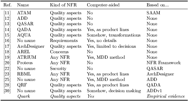 - E. Niemelä and A. Immonen [28] presented the QRF method, this method extends QADA by providing a systematic method for eliciting and defining NFRs, tracing and mapping these requirements to architectural models and for enabling quality evaluation. In Quark the elicitation of requirements is performed previously, in fact, the architect is expected to only introduce the requirements that are architecturally relevant. To this end the QRF method could help in the identification of requirements relevant for the architectural design.