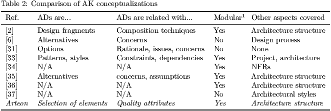 - A. Tang et al. [18]: in this work is published a comparative of five AK tools, with especial emphasis in the name used for architectural concepts.