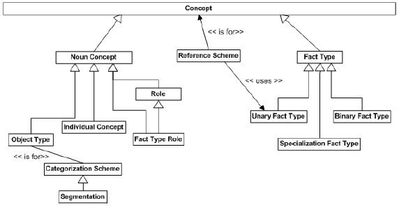 A noun concept is a concept that is the meaning of a noun or noun phrase, which is specialized by: (1) object types, which are noun concepts classifying things on the basis of their common properties; (2) individual concepts, which are concept corresponding to only one object thing and (3) roles, which are noun concepts corresponding to things based on their playing a part, assuming a function or being used in some situation. Additionally, fact type roles are defined as those roles that specifically characterizes its instances by their involvement in an instance of a given fact type.