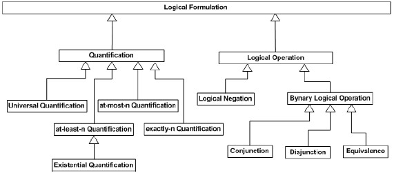 Finally, a SBVR rule is an element of guidance that introduces an obligation or necessity and distinguishing two general types: (1) structural rules, which describe the way the business chooses to organize the things it deals with; and (2) operative rules, which govern the conduct of business activity by describing business processes. Both types of rules are built imposing restrictions over fact types by using quantifiers, logical operators, etc. Figure 2 shows the structural organization of quantifications and logical operations.