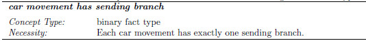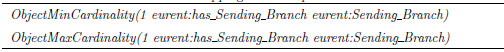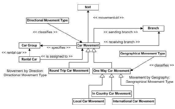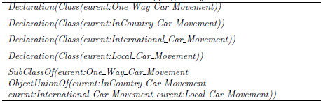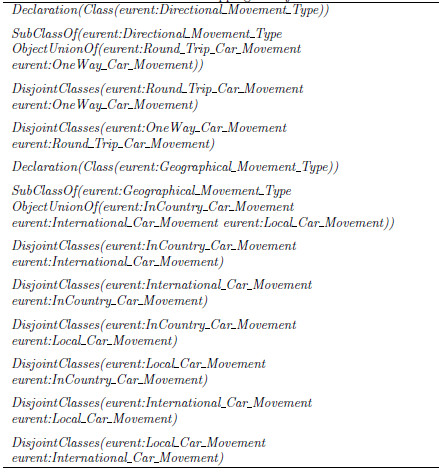 A possible situation is the need of categorizing the individuals belonging to certain entity according to a set of different criteria. Such situation is presented in the case study, where the car movements are classified based on whether the car is returned to a branch different from the pick up branch - directional categorization criteria - and on whether the car crosses local area or international bound- aries - geographical categorization criteria -. Moreover, the categories belonging to each criteria are disjoint between them. In the SBVR context, such modelling are called categorization and segmenta- tion, respectively. While OWL 2 ObjectUnionOf is the way to map a SBVR categorization, OWL 2