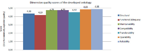OQuaRE also defines performance efficiency and quality in use dimensions. Performance efficiency exposes the relationship between the level of performance of the ontology and the amount of used resources, under stated conditions, taking into account elements such as time of response or memory consumption. Quality in use refers to the degree to which the ontology used by specific users meets their needs to achieve specific goals. However, such dimensions were left out of consideration because there was a lack of metrics for their subcharacteristics (a full description of the applied quality model and the obtained results can be found in http://goo.gl/jcYGJf). Figure 8 shows the quality scores for the ontology developed in the context of the validation example.