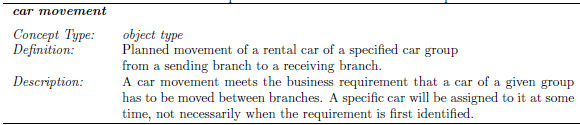 The core of the ontology reflecting the business knowledge exposed by the EU-Rent example is built by applying the translations before depicted. As first step, the mappings of the main object types of the case study are shown in Table 1 , Table 2 and Table 3 3.