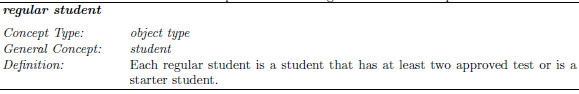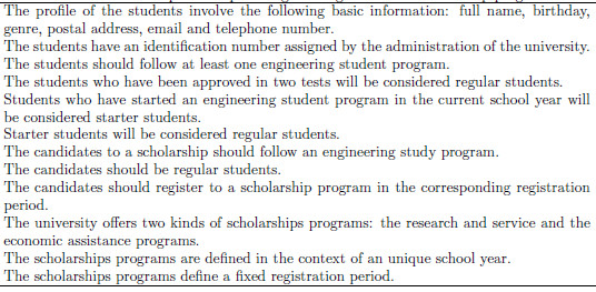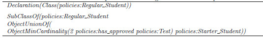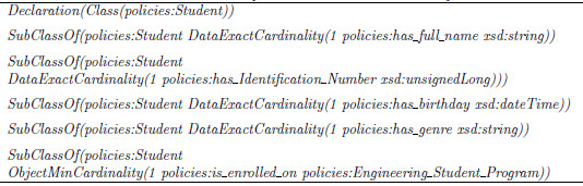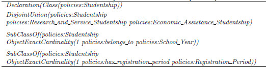 The real case validation example depicted in this section was performed with the aim of evaluating the fea- sibility of the proposed mappings. Such feasibility study is based on the quality assessment of the developed ontology. The example was performed by a three-member group composed by engineering students, in the context of the “Ontology-based Information Systems Development” course at the last year of the Information System Engineering program on the Argentinian Technological University in the province of Santa Fe. The goal of the developed ontologies were to encapsulate business knowledge into information software systems as a mean of achieve an unambiguous representation of knowledge and an efficient management of the dynamic nature of the business domain. By taking part in the experiment, participants earned educational credits. The development of the example involved the ontological specification of the policies governing the student fellowship program of the university. Such policies are stated in a natural language written document (institutional document depicting such policies can be found in http://goo.gl/3txhF9). Table 18 depicts a excerpt of the fellowship program policies. Table 19 , Table 21 , Table 23 , Table 25 , and Table 27 show the SBVR specification of the main domain concepts. Table 20 , Table 22 , Table 24 , Table 26 , and Table 28 present the OWL 2 mappings of the SBVR policies expressions. Figure 7 shows a excerpt of the ontological specification of the main domain concepts. The students made use of text editors to model the business domain according to the followed approach. The ontology implementation was performed by means of Prot´eg´e, a free and open source ontology editor (support, downloads and documentation can be found in http://protege.stanford.edu/).
