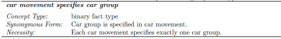 A verb concept - also named fact type - is a concept that is the meaning of a verb phrase that involves one or more noun concepts. It can be used to represent unary relations - i.e., unary fact type -, binary relations - i.e., binary fact type and even n-ary relations. Another important kind of fact type is the Specialization, which represents a relationship between a more general and a more specific concept. Moreover, a Reference Scheme is the SBVR way of identifying instances of a given concept by means of its characteristics specified by means of one or more unary fact types.