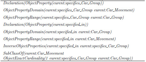 OWL 2 ontology language defines several concrete syntaxes that can be used to serialize and exchange ontologies. Among them, the functional style syntax is defined in the OWL 2 structural specification [17] with the aim to state the semantics of OWL 2 constructors and allow a compact writing of ontologies. Following the structural specification insight, the rest of this paper uses such syntax to state OWL 2 ontology expressions.