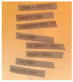 Students should solve the problem of finding the maximum of a list of numbers. We provide students with an algorithm puzzle. Each piece of it is a line of code and there are some extra pieces (different valid solutions could be constructed). Students must select the lines, and recompose the algorithm. In (Fig. 5) is presented an initial (and partially incorrect) solution proposed by one student. Students present their own solutions putting it on the blackboard, and in groups discuss and select the most appropiate. This activity takes about 45 minutes.