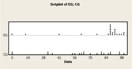 The dot plot shows a distribution of final result of each student. In the EG, most of the students are in the AP1 area (86-100 points) and in the CG they are distributed all over the values.