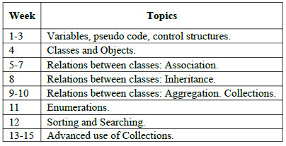 The main topics are: pseudo code, variables, and control structures, objects and classes, association, inheritance, aggregation and collections, enumeration, sorting and searching, and advanced use of collections.