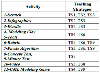 In order to design pedagogical content we define learning outcomes in terms of competences and we align teaching activities with strategies (TS1-TS9) proposed by Crismond and Adams [12]. In Table 3 we map each activity with the selected teaching strategies.