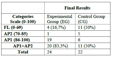 As we exposed, final results of assessments establish a classification into 3 groups according to final scores in a 0-100 scale: students that must retake the course (1-69) (FL), students that must take a final exam (70-85) (AP2) and finally the category of students that approve the course (86-100) (AP1). Fig. 7 illustrates final results of assessments for EG and CG.