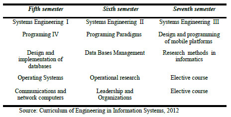 For purposes of this paper, we want to focus on the curriculum integration of a group of courses that are taught in the fifth, sixth and seventh levels in the curriculum and in the way these courses organize the learning process. The initiative aims to integrate three knowledge areas: systems engineering, programming and databases. The strategy suggested is integration by projects. Table 1 shows the courses in these semesters.