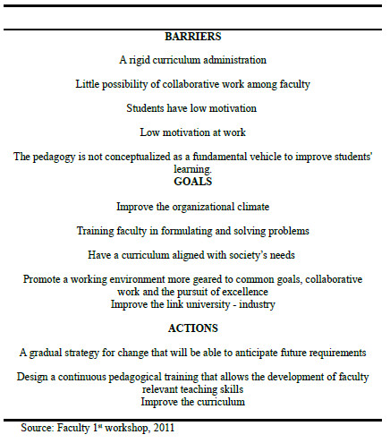 After this first workshop and once there were clarity about the faculty expectations, a series of meetings were held with the participants to discuss possible common ground between courses, at level of learning objectives, content and methodology. In these sessions the participating faculty continued to express some concerns for collaborative work. They also feel distrusting of opening their own courses to other colleagues. Each group of participants belonging to a knowledge area considered themselves experts in its field, most of them expressed that while their courses are likely to improve, the way in which courses are taught is appropriate and achieves the learning objectives they have set. As it can be seen, this attitude is to some extent, not consistent with the desire that participants expressed in the first workshop about promoting a culture of sharing and learning.