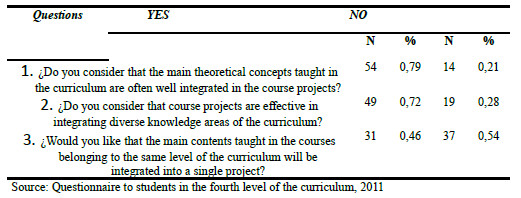 Table 3 shows three items of the questionnaire. As it can be seen, 79% of students think that the main course contents are adequately integrated in the projects; 72% of them believe that the course projects are effective in integrating diverse knowledge areas. However, only 46 % showed a positive attitude towards the integration of the contents of various courses -in the same level of the curriculum- into a single project.